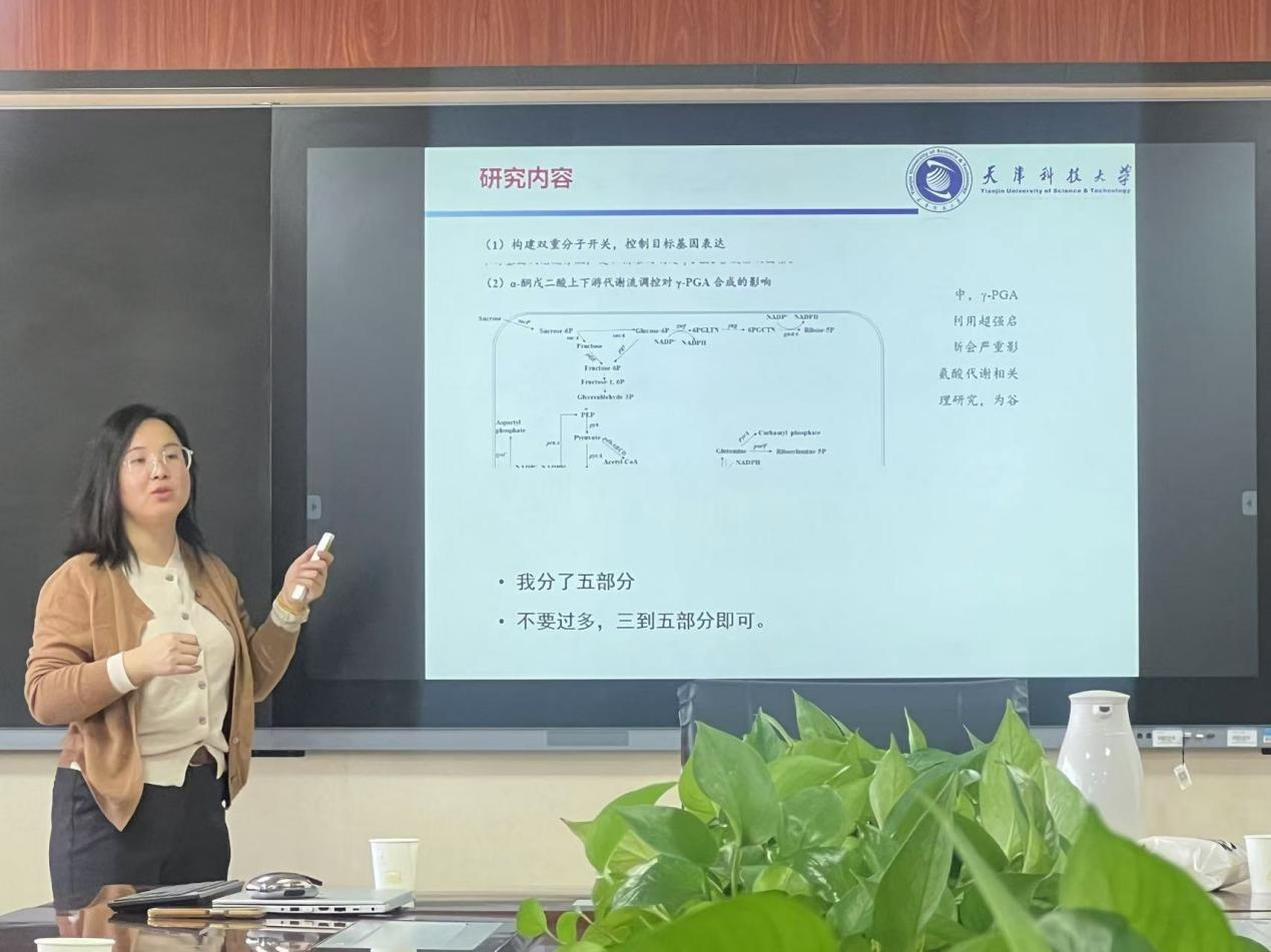在讲座中,高伟霞副教授介绍了功能性生物大分子的绿色生物制造过程。她讲到,通过基因工程、代谢工程等现代生物技术手段,可以实现对生物大分子的高效、绿色制造。γ-聚谷氨酸(γ-PGA)是可食用、降解、水溶、修饰的天然聚合物,应用潜力大。该团队以谷氨酸非依赖型菌株解淀粉芽孢杆菌为研究对象,探究谷氨酸非依赖型菌株γ-PGA合成的限速因子并构建代谢模型,为谷氨酸非依赖型菌株针对性强化γ-PGA合成代谢且不影响菌株生长提供新策略。其研究团队取得了多项成果,特别是在多糖开发及应用、芽孢杆菌底盘细胞合成高附加值产品等方面,取得了多项创新性成果。