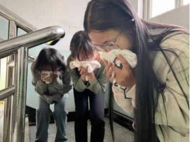 在领导和老师的耐心讲解后,同学们迅速进入宿舍楼进行消防演练。警报铃声响起,同学们听到铃声,纷纷打湿毛巾,捂住口鼻,弓着腰,俯首低行,按照规划的疏散路线有秩序撤离宿舍楼。